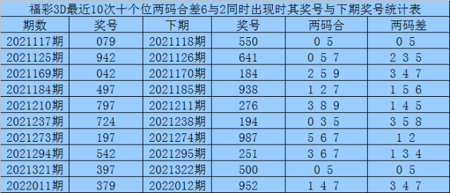 十个位合差分析:上期奖号十个位开出79组合,两码合为6,两码差为2,最近10次十个位两码合6与两码差2同时出现时,其奖号和下期奖号分别为: