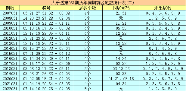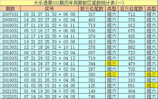 在大乐透第031期历年同期奖号中,前区后三位尾数出号频次分别为:尾数2、3、7出现7个,尾数5、9出现5个,尾数0、1、6出现4个,尾数8出现3个,尾数4出现2个。其中尾数数字三类型豹子、组三、组六次数比为0:2:14,今年同期后三位尾数类型参考组六;