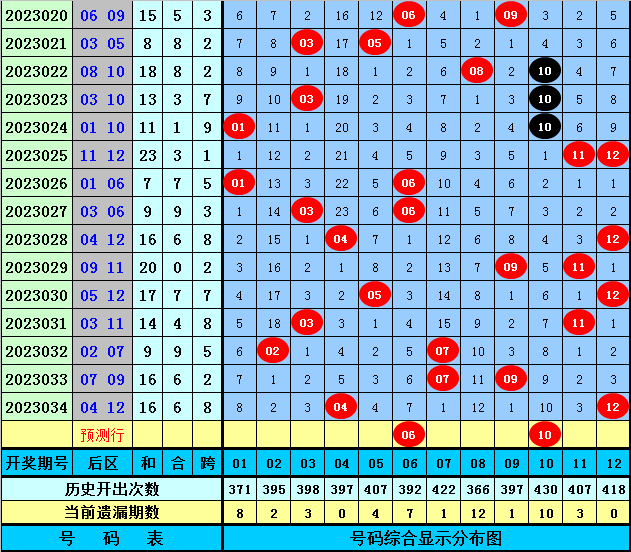 后区分析:上期后区开出第一区和三区号码04+12,最近10期后区三区落号比为0:0:2,最近5期后区三区落号比为0:1:1,本期后区号码大范围关注03、05、06、08、10,后区精选两码06、10。