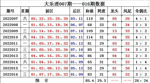 上期回顾,大乐透第2022016期开奖,本期奖号:前区01 07 17 26 32;后区01 09,当期前区号码大小比为2:3,三区比2:1:2,奇偶比为3:2。前区未开出连号,开出重号01。