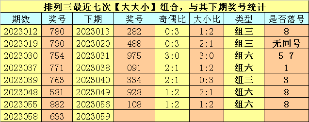 大小分析:排列三上期开出号码693,大小类型为【大大小】,最近七次开出大小类型大大小的奖号分别为:780、790、754、771、763、581、882,其下期分别开出号码:282、488、975、091、334、928、108。其中号码大小比为10:11,大小号码基本持平,本期预计大号转热,注意全大组合开出。