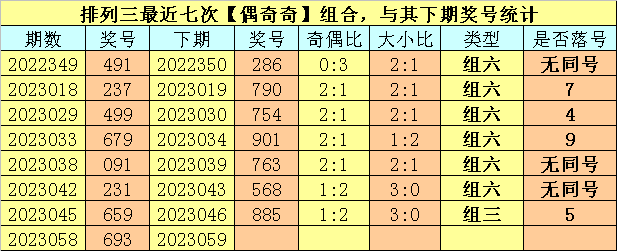 奇偶分析:排列三上期奖号为693,其奇偶类型为【偶奇奇】,最近七次出现奇偶类型偶奇奇的号码分别为:491、237、499、679、091、231、659,其下期奖号分别为:491、237、499、679、091、231、659。其中号码奇偶比为10:11,奇偶奖号开出比例基本相当,本期奇数热出的可能性较大,预计出现2个奇数号码。