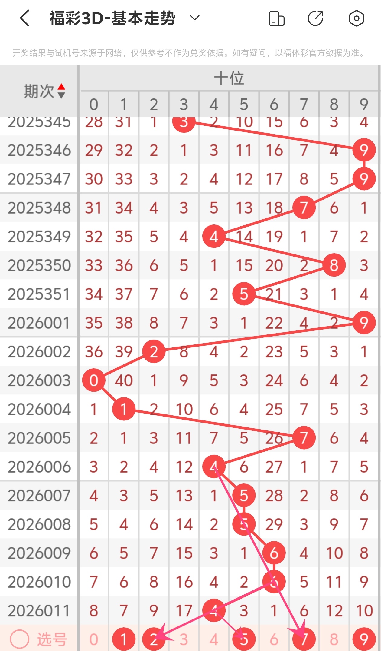 上期十位开出4,本区与上期的跨度为2,本期我们可以从上面走势图中看出选号的思路,2为斜连走势跨度为二,5为分边走势,7为斜连走势跨度为三,综合以上分析,本期十位推荐:12579