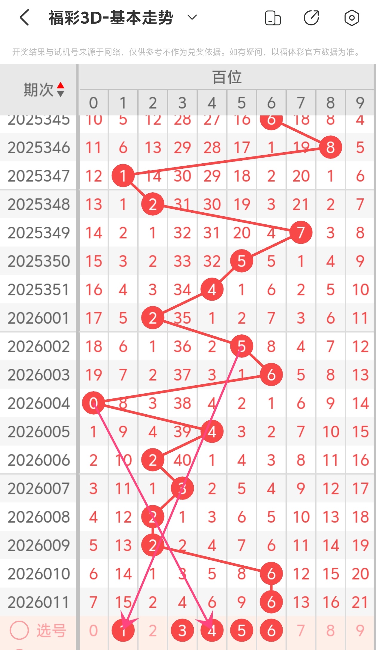 上期百位开出6,本区与上期的跨度为0,本期我们可以从上面走势图中看出选号的思路,1为斜连走势跨度为五,4为斜连走势跨度为二,6为重码,综合以上分析,本期百位推荐:13456