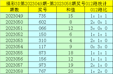上期回顾:福彩3D第2023058期开出奖号:767。奖号为组三形态,与试机号没有同,奇偶比为2:1,大小比为3:0,012路比为1:2:0,和值为20,跨度为1。