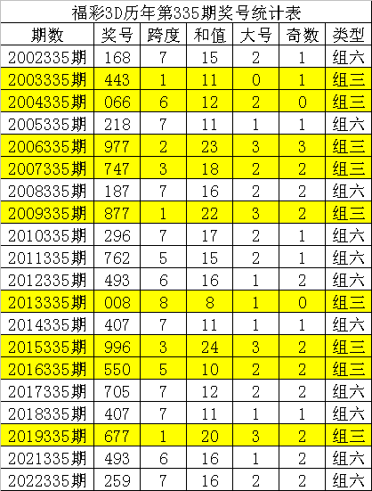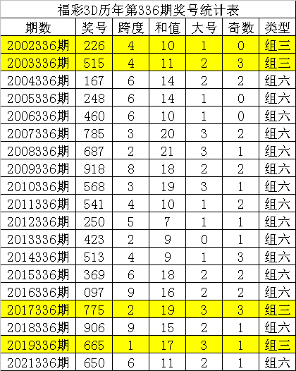 从以上统计可以看出,历年3D第336期开出了4次组三号码,开出了15次组六号码。组六号码出现概率大,本期预计开出组六号码。