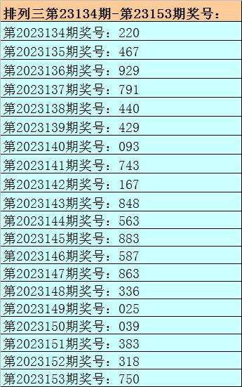 开奖回顾:排列三第2023153期开出奖号:750。其中奖号大小比为2:1,奇偶比为2:1,012路比为1:1:1,和值为12,跨度为7。
