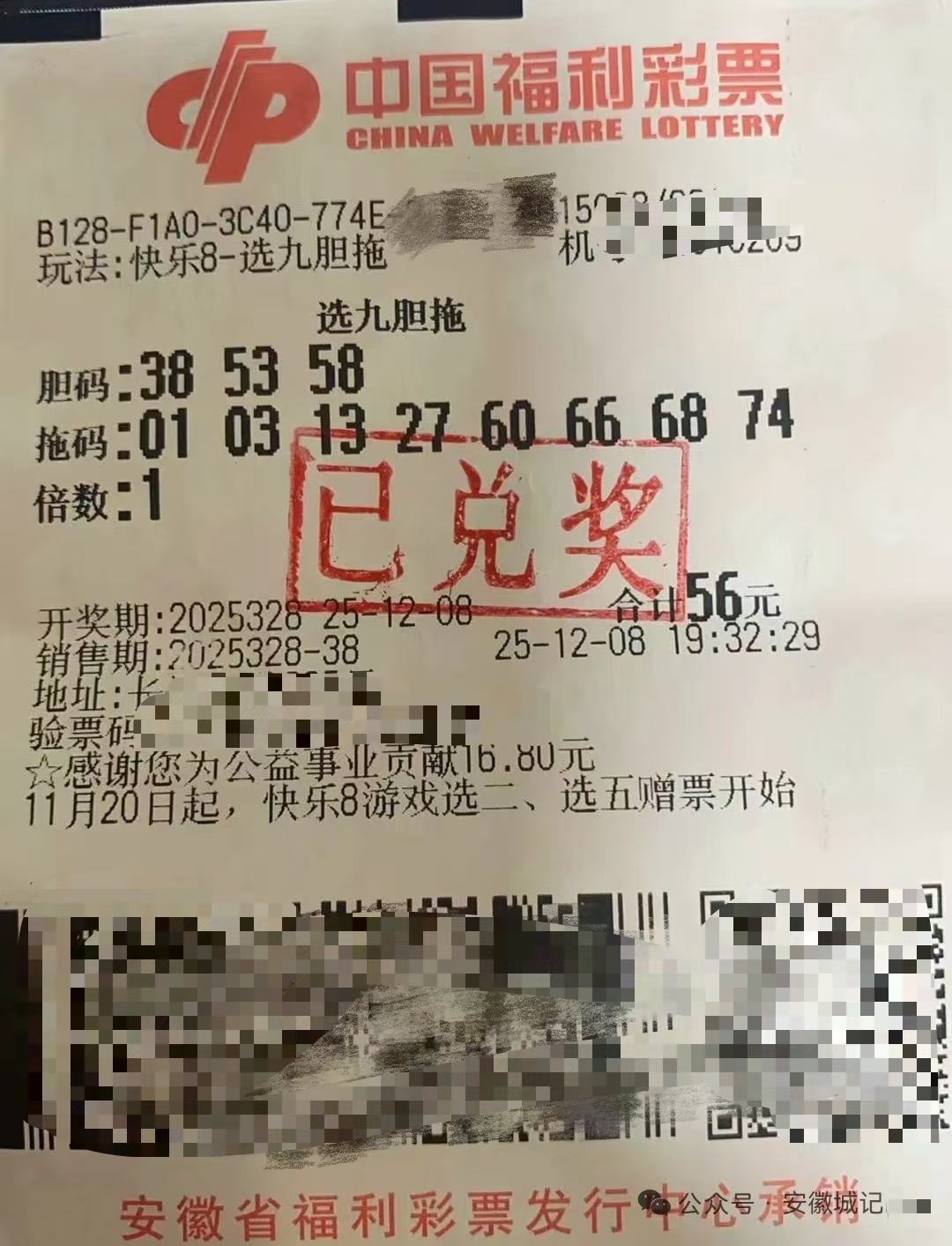 12月8日晚,中国福利彩票"快乐8"游戏第2025328期开奖传喜讯,合肥市一位幸运购彩者凭借一张机选胆拖票,成功命中32.7万元大奖。这是合肥市本月诞生的首个"快乐8"大奖,为冬日彩市增添了一份喜庆气氛。