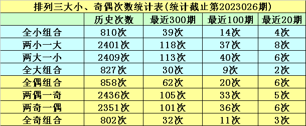 大小形态判断:最近5期小号出现个数分别为:3-3-2-1-0,大号开出个数分别为:0-0-1-2-3,总大小比为6:9,大号出现较少;