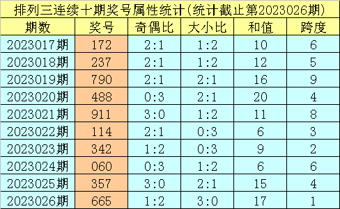 上期回顾:排列三第2023026期奖号:665。类型:组三,奇偶形态:偶偶奇,大小形态:大大大,和值:17,跨度:1。