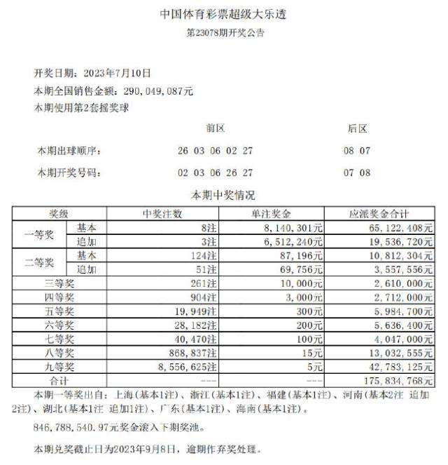 北京时间7月10日晚,体彩大乐透第23078期开奖,当期开奖号码为:前区02 03 06 26 27,后区07 08。