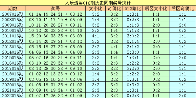 后区判断:后区第016期历史同期奖号大小比总比例为18:14,小号表现较冷,本期防止小号回补,关注一大一小组合开出,看好两码02、12。