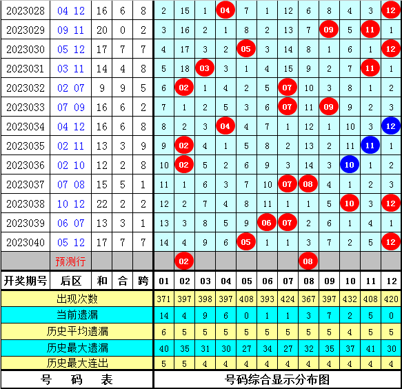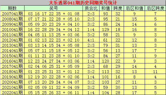 后区分析:在第041期历史同期开奖中,后区和值分别开出9、15、14、16、9、12、13、17、11、9、14、13、8、11、13、17,本期看好后区开出偶数和值,参考和值10。