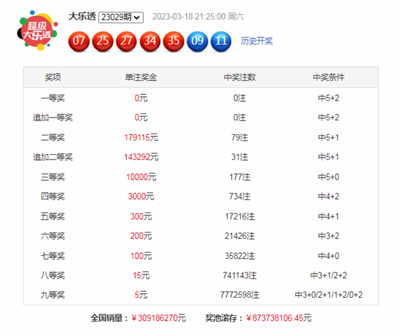 大乐透第2023029期开奖,前区奖号:07、25、27、34、35;后区奖号:09、11。其中前区奖号和值为128,跨度为28,奇偶比为4:1,012路比为1:3:1,后区号码分别遗漏8期和3期。