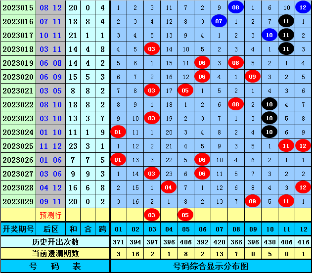 后区分析:上期后区开出遗漏8期和3期的奖号09和11,最近10期后区冷温热码(遗漏期数大于9期为冷码,遗漏4-9期之间为温码,遗漏0-3期为热码)出现个数比为2:7:11,目前后区号码遗漏期数分别为:号码09、11遗漏0期,号码04、12遗漏1期,号码03、06遗漏2期,号码01遗漏3期,号码10遗漏5期,号码08遗漏7期,号码05遗漏8期,号码07遗漏13期,号码02遗漏16期,本期后区参考号码01、03、05、09、12,精选两码03、05。