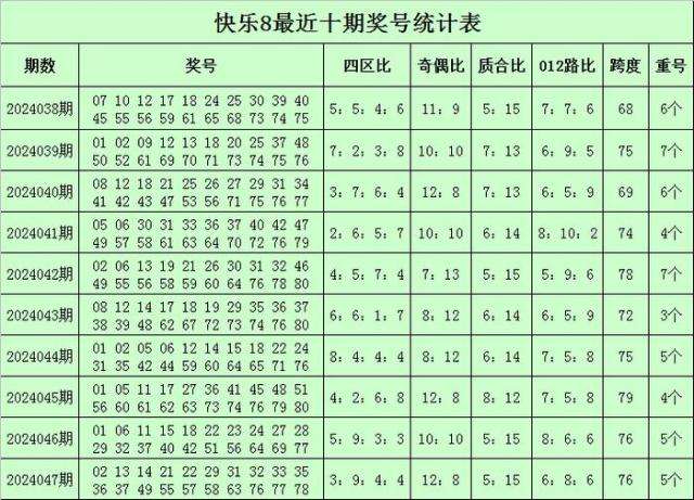 福彩快乐8第2024047期开奖回顾:02 13 14 21 22 29 31 32 33 35 36 37 49 55 57 58 63 76 77 78,其中奖号四区比为3:9:4:4,奇偶比为12:8,质合比为5:15,跨度为76,012路比为6:8:6,开出5个重号:22、29、32、37、77。