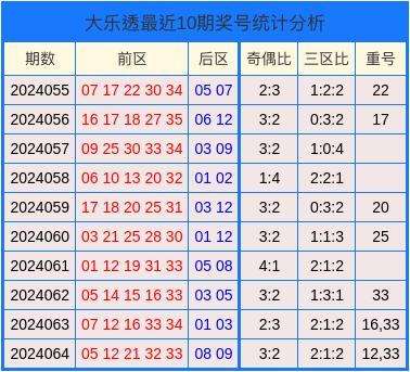 开奖回顾:大乐透第2024064期奖号:05、12、21、32、33+08、09。其中奇偶比为3:2,三区比为2:1:2,开出2枚重号12,33。