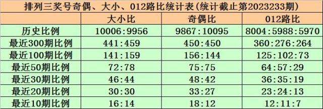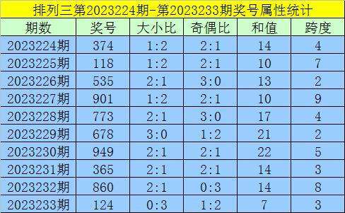 上期回顾:排列三第2023233期出现奖号124。开出组六,奇偶比1:2,012路比0:2:1,大小比0:3,和值7,跨度3。