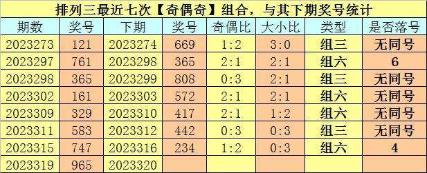 奇偶分析:排列三上期奖号为965,其奇偶类型为【奇偶奇】,最近七次出现奇偶类型奇偶奇的号码分别为:121、761、365、161、329、583、747,其下期奖号分别为:121、761、365、161、329、583、747。其中号码奇偶比为8:13,奇数奖号开出比例较低,本期注意奇数回补的可能,关注奇偶比2:1。