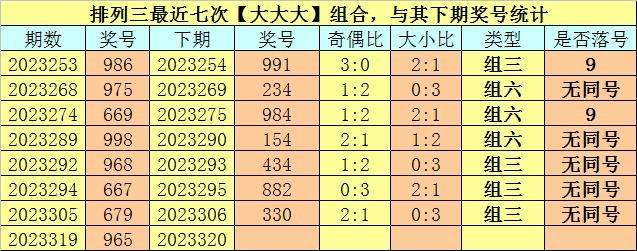 开奖回顾:排列三第2023319期开奖号码为:965。奖号类型为:组六,大小类型为:大大大,奇偶类型为:奇偶奇,包含重号:9。