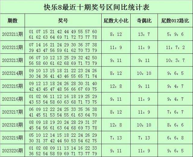 福彩快乐8第2023220期开奖回顾:01 02 08 09 11 13 14 16 22 33 36 52 54 58 59 69 71 73 77 79,其中奖号尾数奇偶比为11:9,尾数大小比为9:11,尾数012路比为9:6:5。