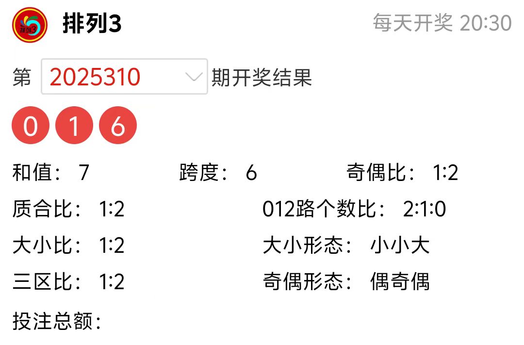 排列3上期(2025310期)开奖号码详情