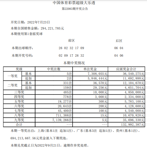 北京时间7月23日晚,体彩大乐透第22083期开奖。当期开奖号码为:前区02 09 17 26 32,后区04 06。