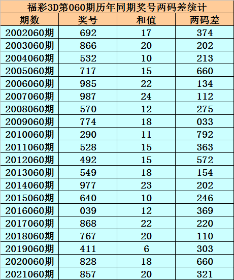 福彩3D第060期,历史上期开出20次奖号,其奖号分别为:692、866、532、717、985、987、570、774、290、528、492、549、977、640、039、868、767、411、828、857,奖号两码合差分别开出: