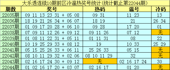 大乐透第22035期-第22044期前区奖号冷温热分布统计: