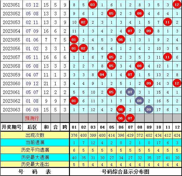 二、后区预测:后区上期开出号码06、09,为温码+热码,目前后区遗漏值4以内的热码有8个:01、04、05、06、07、08、09、12;遗漏值5-11之间的温码有2个:02、11;遗漏值12以上的冷码有2个:03、10、本期看好出现重号,关注两码06、07。