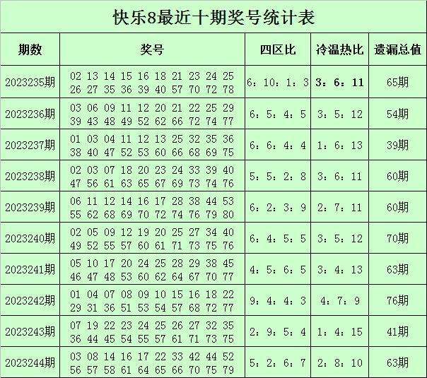 福彩快乐8第2023244期开奖回顾:03 08 14 16 17 22 33 42 44 52 56 57 58 61 64 65 66 70 75 79,其中奖号四区比为5:2:6:7,冷温热码比为2:8:10,遗漏总值为63。