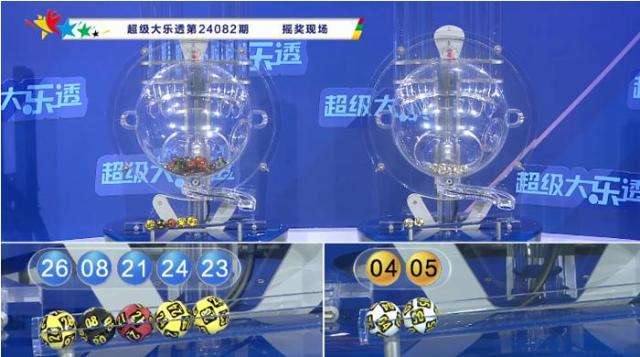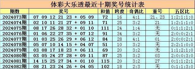 上期开奖:大乐透第2024082期奖号为:08 21 23 24 26 + 04 05,前区号码和值为102,跨度为18,奇偶比为2:3,无重号,五区比为0:1:1:3:0。