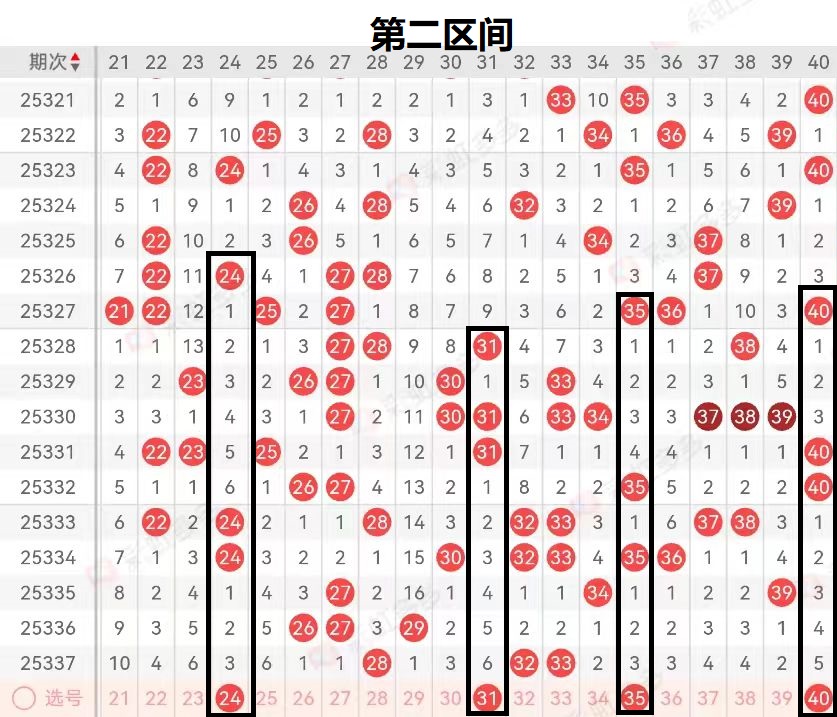 上期第二区间开出了(28 32 33)三个号码球,上期冷态三码在二区间落位。区间号码走出冷态三码落位。那么通过对上期二区间落位号码进行研判我们可以发现整个区间号码走出区域落位,区间前端断区,前端独码28号码球开出。那么通过对二区间号码的落位趋势进行分析可以看到二区间的走势在本期落位后趋势向温态回调的可能性最大,区间中端32-33姊妹对号码球开出。那么本期我们在二区间进行操作时一定要加强对二区间形态号码球的研判,所以我们在二区间进行操作时一定要考虑区间热态号码更为合理。