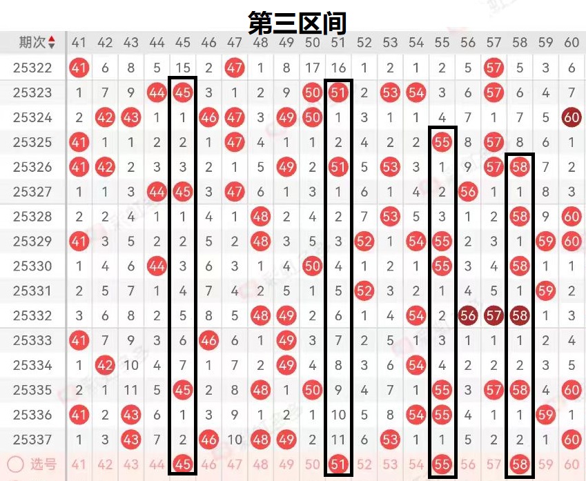 上期第三区间开出了(43 46 48 49 53 60)七个号码球,上期三区间开出热态六码落位,上期三区号码落位处于区间的前后端。区间前端43-46对应号码球开出,区间后端5字头独码60号码球开出,那么通过对三区间的整体分析来看我认为接下来三区间号码在区间走出震荡后形成下行落号,区域会走出小范围的震荡。那么大家一定要注意区间号码的冷调整趋势,通过对三区间近期号码的分析来看号码走出温态调整的可能性最大。那么通过分析来看三区间在近期会继续出现走势分化的趋势,因此我们在对三区间进行分析后得出,未来我们要重点考虑近期回补号码球更为妥当。