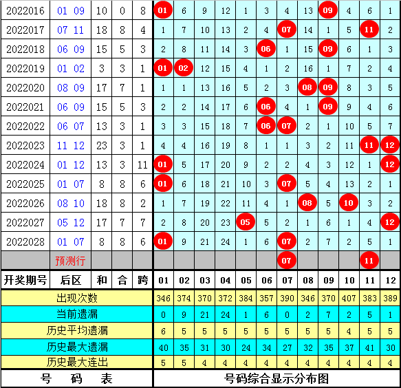 本期后区号码参考:01 07 09 10 11