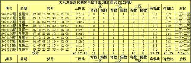 前区三区走势:上期前区奖号三区比为1:1:3,最近10期前区奖号三区比为20:12:18。