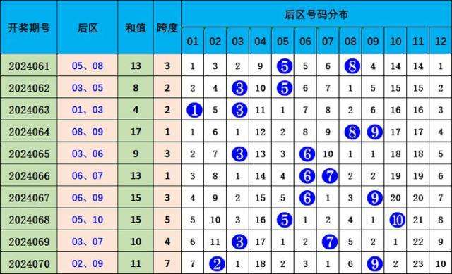 上期后区号码为02号和09号,为小大偶奇组合,近10期后区大小比为8:12,012路比为10:4:6,重点推荐偶奇组合08 11。