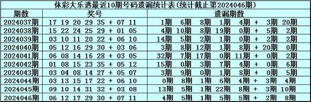 体彩大乐透第2024046期奖号为:06 12 17 29 30 + 07 11,前区号码奇偶比为2:3,大小比为2:3,和值为94,012路比为3:0:2,后区号码奇偶比为2:0,大小比为2:0。