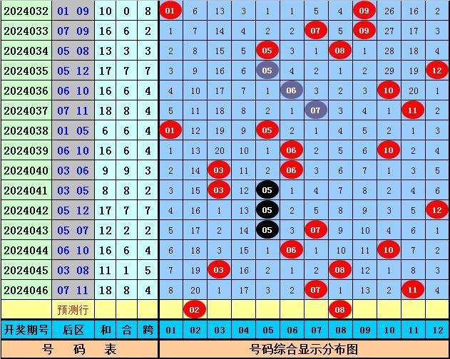 后区分析:上期该位开出奖号07和11,和值为18,跨度为4,后区前4次开出和值18和跨度4时,其下期奖号分别为:04+05、03+12、08+11、01+05,号码奇偶比为5:3,大小比为3:5,012路比为2:2:4,本期后区号码参考02、03、08、09、10,精选两码02、08。