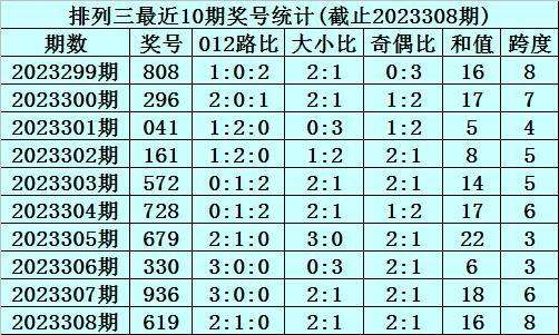 上期回顾:排列三2023308期奖号为619,奇偶比为2:1,大小比为2:1,跨度为16。