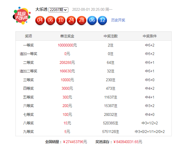 大乐透第2022087期奖号开出:04 06 10 24 28 + 06 12,各位奖号遗漏期数分别为:0期、12期、0期、20期、0期+1期、2期,前区遗漏总值为32期,冷温热码个数比为2:0:3。