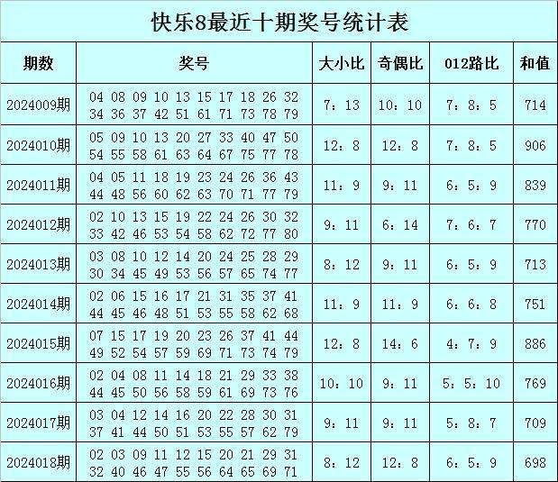 福彩快乐8第2024018期开奖回顾:02 03 09 11 12 15 20 21 29 31 32 40 46 47 55 56 64 65 69 71,其中奖号奇偶比开出12:8,大小比开出8:12,012路比开出6:5:9,和值为698,跨度为69。