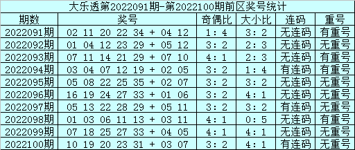 上期回顾:体彩大乐透第22100期奖号开出:10 19 20 23 31+03 07,前区奖号奇偶比为3:2,012路比为0:3:2,大小比为4:1,包含连码:19 20,没有开出重号。