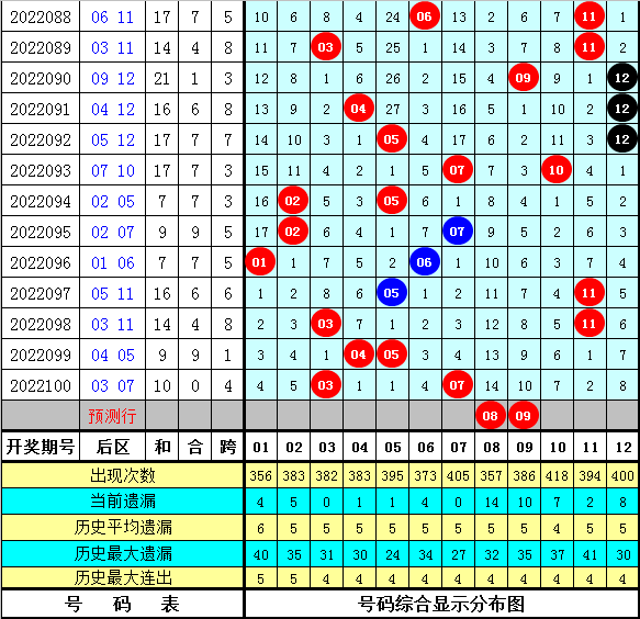 后区分析:上期后区奖号为03和07,最近10期后区各号码频次为:号码05出现4次,07出现3次,02、03、04、11、12出现2次,01、06、10出现1次,其中号码08、09没有出现,本期后区参考号码03、05、07、08、09、12,单注参考08+09。