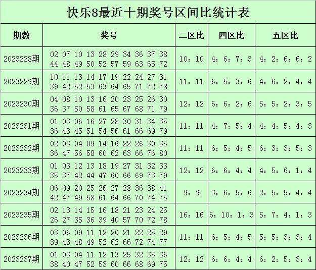 福彩快乐8第2023237期开奖回顾:01 03 04 11 12 13 25 32 35 36 38 40 47 52 53 60 66 68 69 75,其中奖号二区比为8:12,四区比为6:6:4:4,五区比为6:2:5:3:4,除2余数比为10:10,除4余数比为8:5:2:5,除5余数比为5:4:4:5:2。