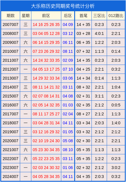 后区分析:去年同期后区号码为04、11,在历史同期数据中出现过2次04、11,出现得概率为11。11%,本期预测后区开出02,07的可能性较大。