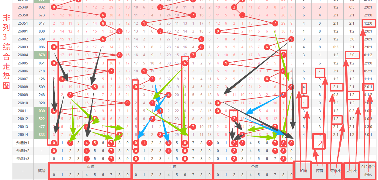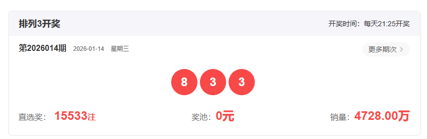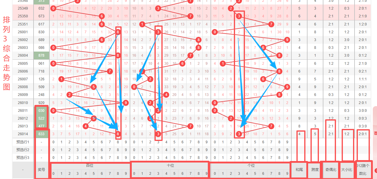 体彩排列3第2026014开奖号码833,形态为组三,奇偶比2:1,和值14,跨度5,大小比1:2,【012】路个数比2:0:1。