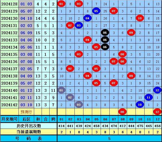 后区分析:在第143期历史同期开奖中,后区奖号奇偶比为10:20,最近5年同期后区奇偶走势为:一奇一偶、全偶、一奇一偶、一奇一偶、全偶,今年同期预计再出全偶组合,关注号码08、12。