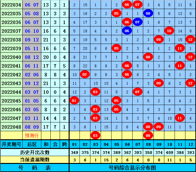 前区第二位:上期开出奖号22,为奇数,对比前期上升12个点位,近10期前区第二位在08-14之间出现了3次,表现相对较冷,本期预计前区第二位号码在该区段回补,关注奖号08。