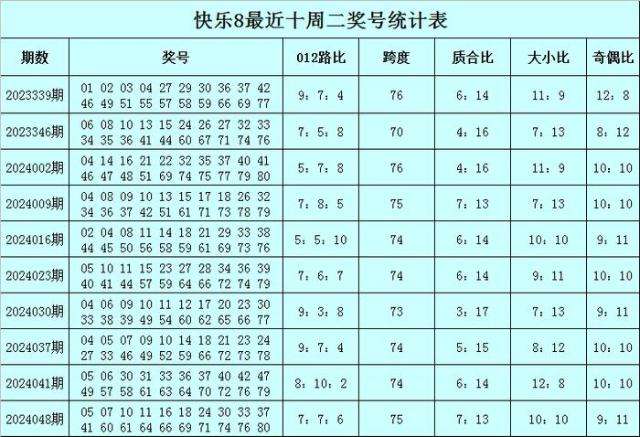福彩快乐8第2024048期(上周二)开奖回顾:05 07 10 11 16 18 24 30 33 37 41 60 61 64 66 69 71 74 76 80,其中奖号012路比为7:7:6,跨度为75,质合比为7:13,大小比为10:10,奇偶比为9:11。